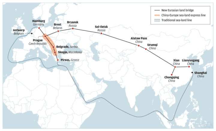 يُمثِّلُ الممرُّ البريُّ الجديد امتدادًا عمليًّا لمبادرة “الحزام والطريق”؛ إذ يعزز الترابط بين آسيا وأوروبا عبْر شبكة مُعقَّدة من السِّكَكِ الحديديةِ والطُّرُقِ السريعةِ وخطوط الشحن؛ حيث تهدف بكين من خلال ذلك إلى ترسيخ نفسها كـمركز للتجارة العالمية؛ بحيث تصبح أوروبا مرتبطةً بشكلٍ مباشرٍ بالعُمْق الصيني، وهذا الترابط لا يقتصر على التجارة فقط، بل يفتح المجال أمام الصين لتوسيع دوائر نفوذها السياسي والاقتصادي عبْر الدول الواقعة على طول المسار.